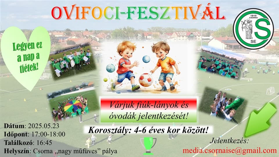 A Csornai SE szervezésében megrendezésre kerül az Ovifoci-fesztivál, ahol a 4–6 éves gyerekeké lesz a főszerep.