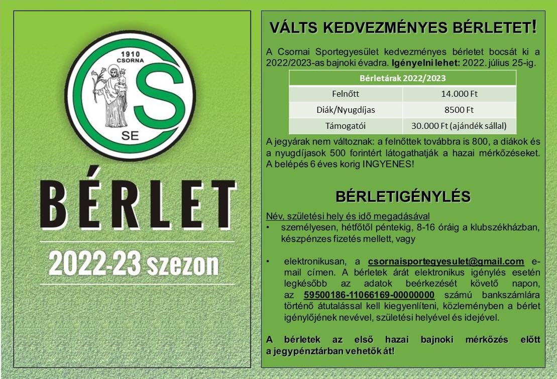 2022. július július 25-ig lehet kedvezményesen bérletet vásárolni a Csornai SE hazai mérkőzéseire. A felnőtt bérlet ára 14.000 Ft, a diák és nyugdíjas bérlet pedig 8500 Ft. Támogatásokat is szívesen fogad az egyesület.